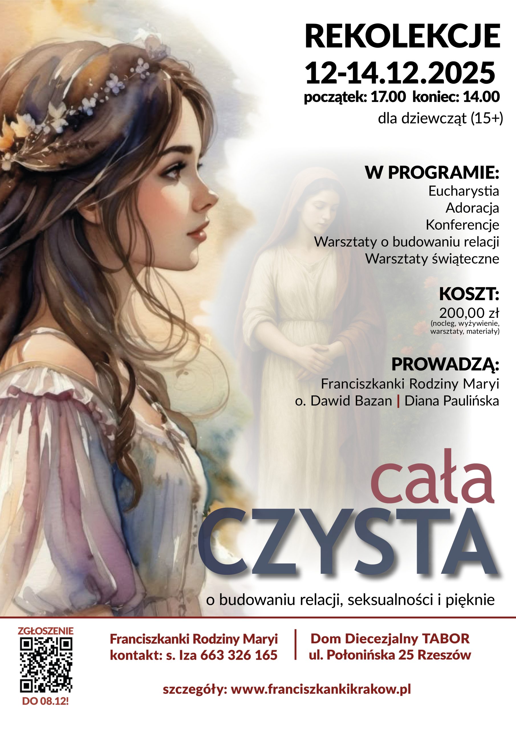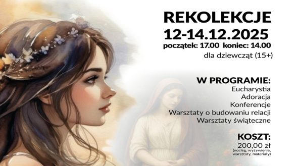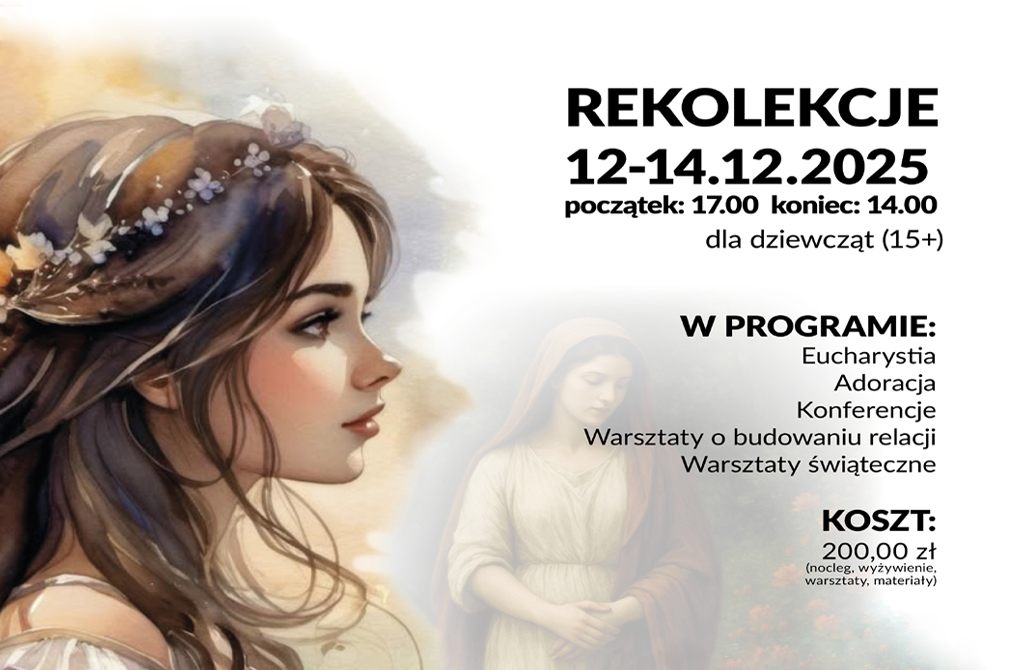 Rekolekcje dla dziewcząt Parafia w Rzeszowie 22.11.2025 Zapraszamy w dniach 12-14 grudnia 2025 r. Podziel się tym wpisem: